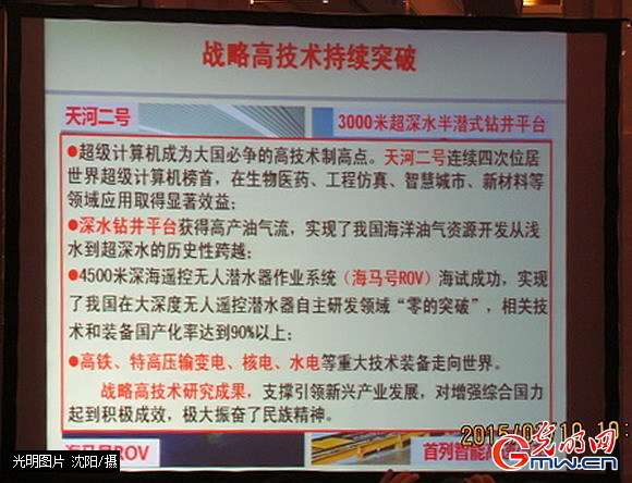 光明网梳理了万钢部长上午工作报告中所披露的系列中国科技实力新特点、新常态,它们包括:科技资源开放共享机制初步确立,基础前沿研究加速赶超引领,战略高技术持续突破,科技促进产业优化升级成效凸显等。