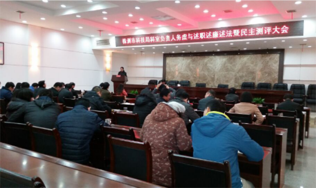 1月15日上午,株洲市科技局召开了科室负责人务虚与述职述廉述法暨民主测评大会。会议由副局长龚道富主持,全体在职领导、干部参加会议学习。