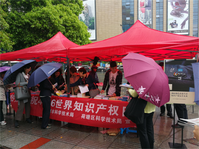 2017年4月26日,是第17个世界知识产权日,当日,株洲市科技局联合荷塘区科技局开展了以“创新改变生活”为主题的系列宣传活动。宣传活动包括开展知识产权维权援助与举报投诉讲座,以及4·26宣传周大型广场宣传咨询暨维权援助志愿者主题活动。来自株洲市科技局、株洲(中国)知识产权维权援助中心、各县市区经科局,以及企业和相关中介服务机构的维权援助志愿者参加了此次活动。