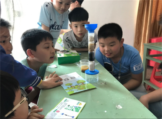 “电吹风对着风扇吹风,LED(发光二极管)怎么会亮起来呢?”“快来快来,从最上面这个塑料漏斗里倒下去的污水,到了下面的塑料杯里怎么就变成了清水了呢?”……如此等等。孩子们通过自己动手组装、操作科普器材,一个个兴趣盎然并睁大了好奇的眼睛。