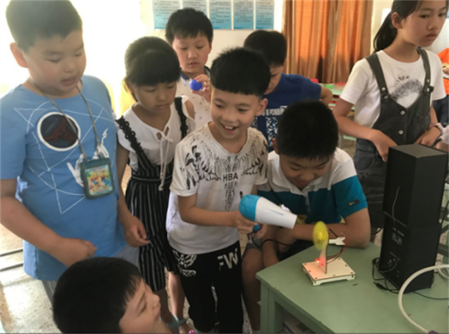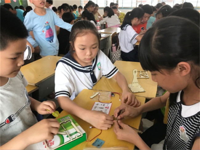 刘伟鹏、苏兆卿等同学在做“风力发电”实验时,发现无论是用嘴或用电吹风对着风扇用力吹,LED发光二极管就是不亮。于是,请教指导老师,发现导线连接错误。他们重新连接导线后,用电吹风对着风扇比用嘴对着风扇用力吹,LED发光二极管发出的光亮更稳定。孩子们被各式科普套材体验深深地吸引住了,围着一件件刚刚完成的神奇的实验装置或物品好奇地琢磨着。科技辅导员余老师说,发明其实离大家并不遥远,只要你们热爱生活、热爱思考,人人都是发明家,处处都是发明地。孩子们在互动中,不仅听得入迷、还看得出神。