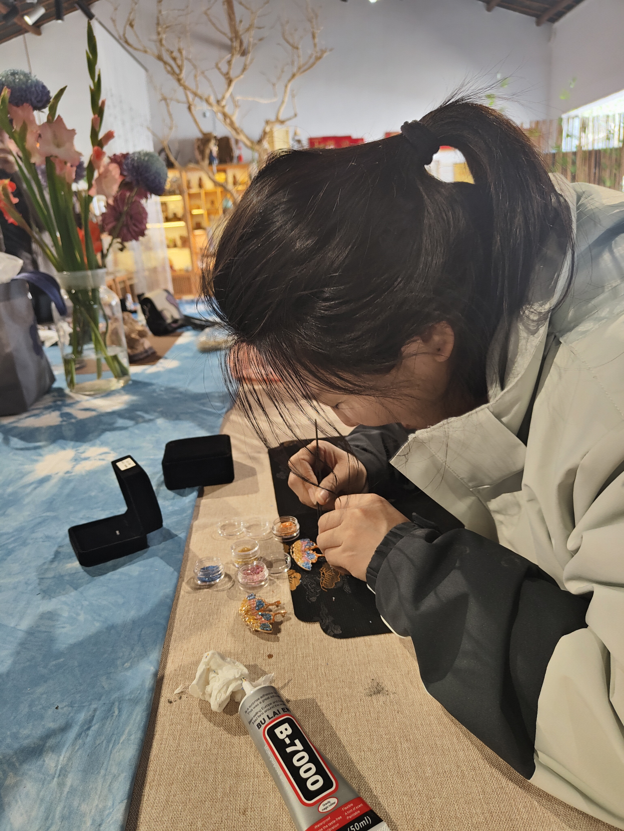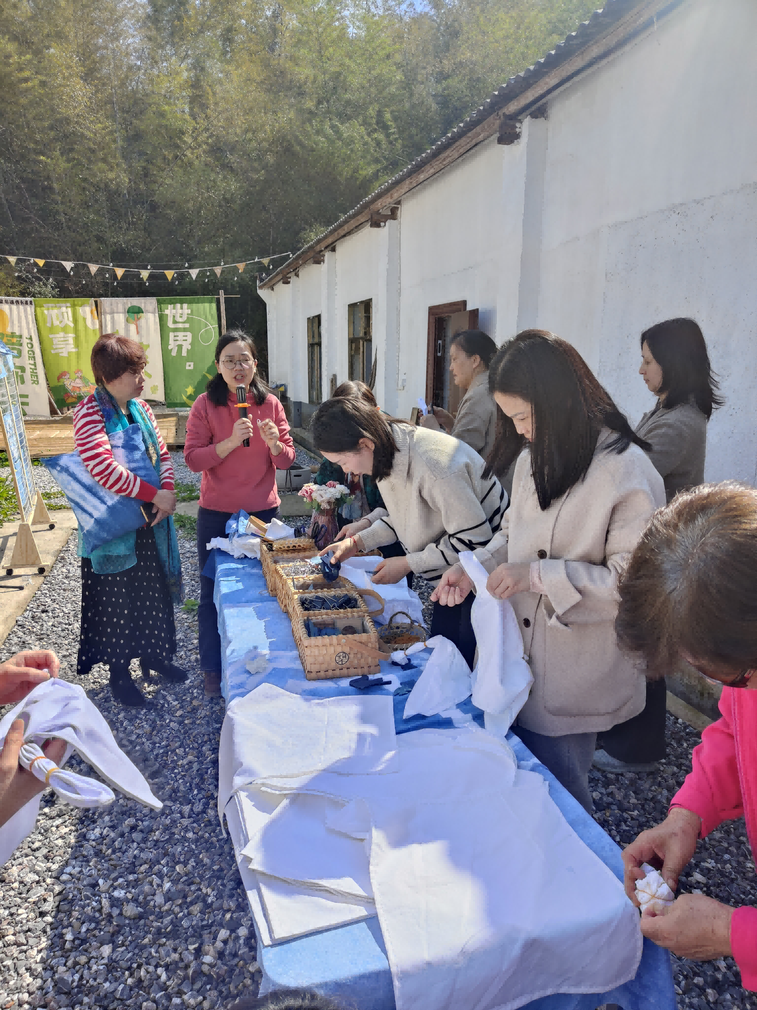 活动在愉快热烈的气氛中进行。大家兴致勃勃地围绕在非遗传承人的周围,仔细聆听扎染和非遗螺钿的制作工艺,并在老师手把手的指导下,亲身体验了一次扎染和非遗螺钿的制作过程。看着一块块白布在自己手中染成了希望的颜色和图案,看着一只只蝴蝶披上了美丽的“衣裳”,振翅欲飞,大家都开心地笑了。