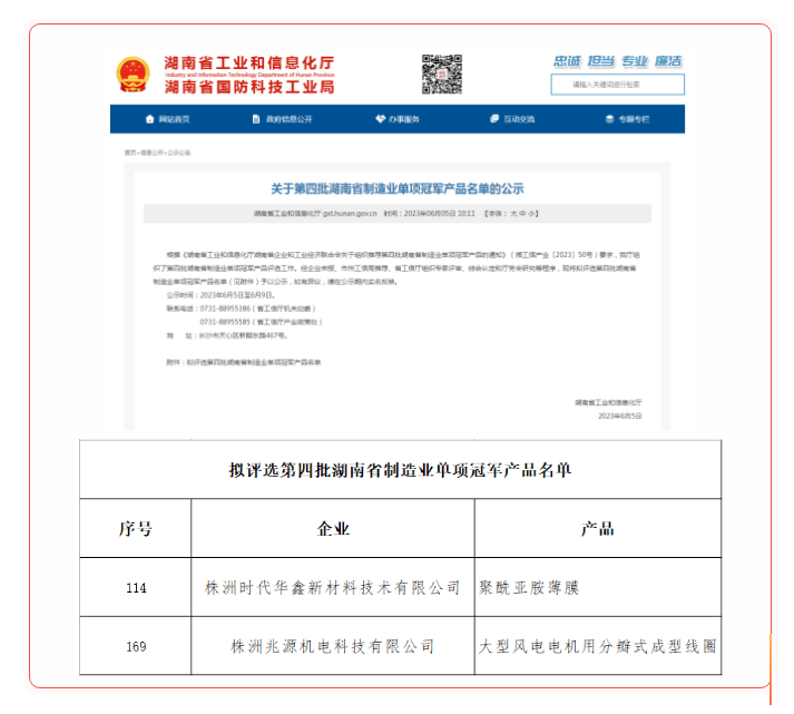 其中,株洲时代华鑫新材料技术有限公司(聚酰亚胺薄膜技术)、株洲兆源机电科技有限公司(大型风电电机用分瓣式成型线圈)成功入选,为制造强区再添荣誉