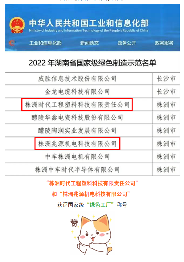 其中渌口区两家企业上榜,为制造强市做出更多渌口贡献,“株洲时代工程塑料科技有限责任公司”和“株洲兆源机电科技有限公司”获评国家级“绿色工厂”称号