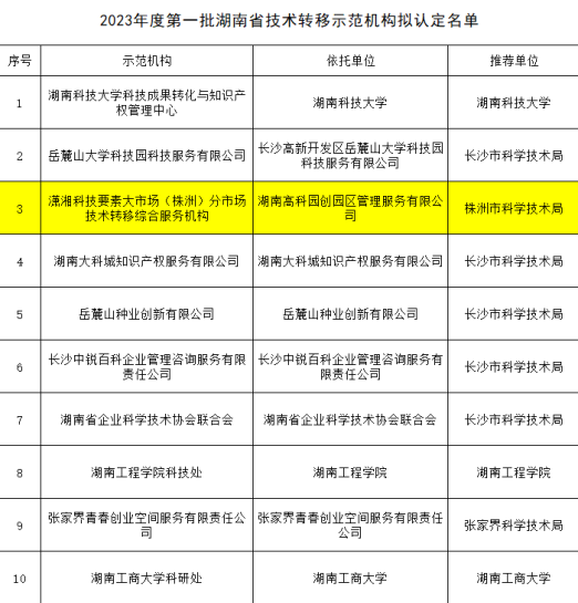 近日,湖南省科学技术厅发布了《关于认定2023年度第一批湖南省技术转移示范机构的通知》。湖南高科园创园区管理服务有限公司以潇湘科技要素大市场(株洲)分市场为载体成功获批湖南省技术转移示范机构。湖南省技术转移示范机构的认定,更利于强化科技项目组织管理机制,推动重点领域项目、基地、人才、资金一体化配置。未来,高科园创将持续完善专利技术供需对接机制,以精准、高效、有力的服务,切实解决企业发展技术难题。