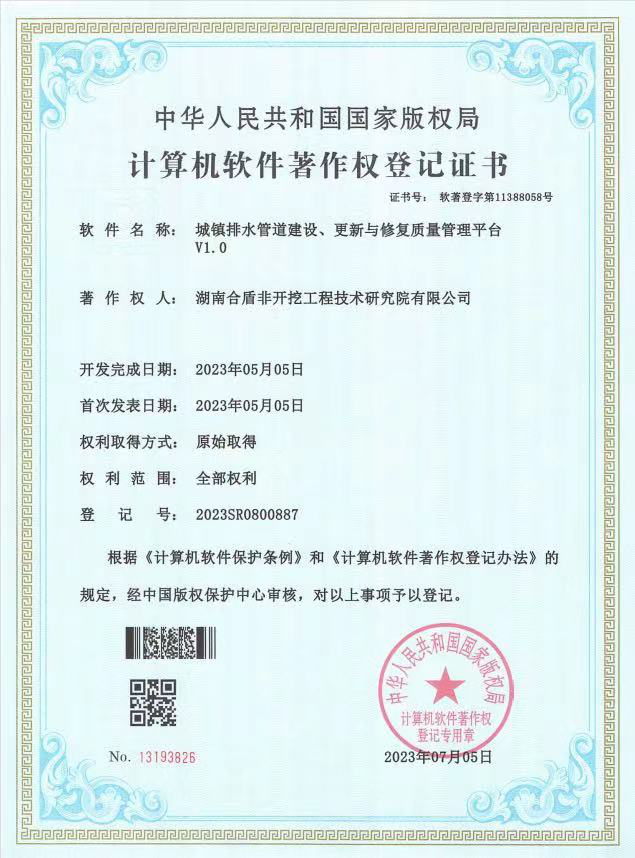 近日,湖南合盾非开挖工程技术研究院有限公司申报的“城镇排水管网运行监测、运维管理、调度指挥平台”科技创新成果荣获国家版权局颁发的软件著作权登记证书。该公司产品版权将得到“中国版权保护中心”的有效保护。
