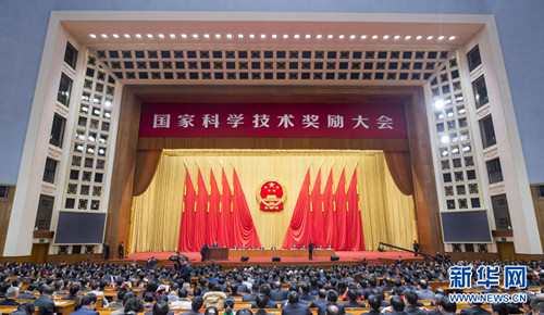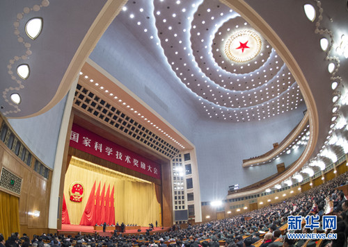 1月9日,国家科学技术奖励大会在北京人民大会堂举行。2014年度国家科学技术奖励共授奖318项成果、8位科技专家和1个外国组织。新华社记者王晔摄