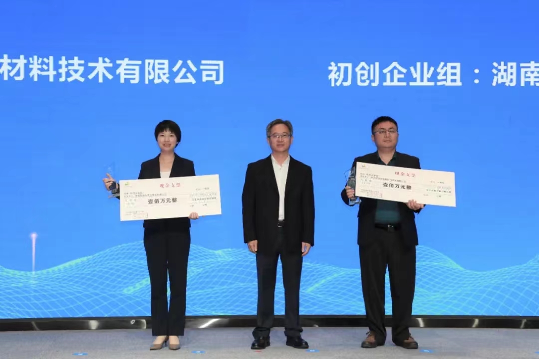 省科技厅党组书记、厅长李志坚为2021年湖南省创新创业大赛一等奖获奖代表颁奖。