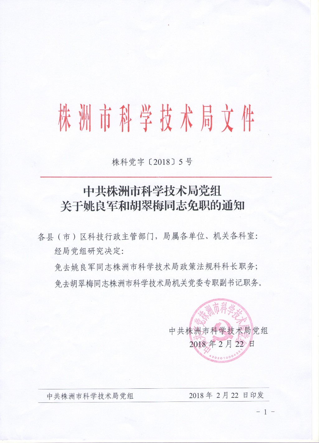 中共株洲市科学技术局党组关于姚良军和胡翠梅同志免职的通知