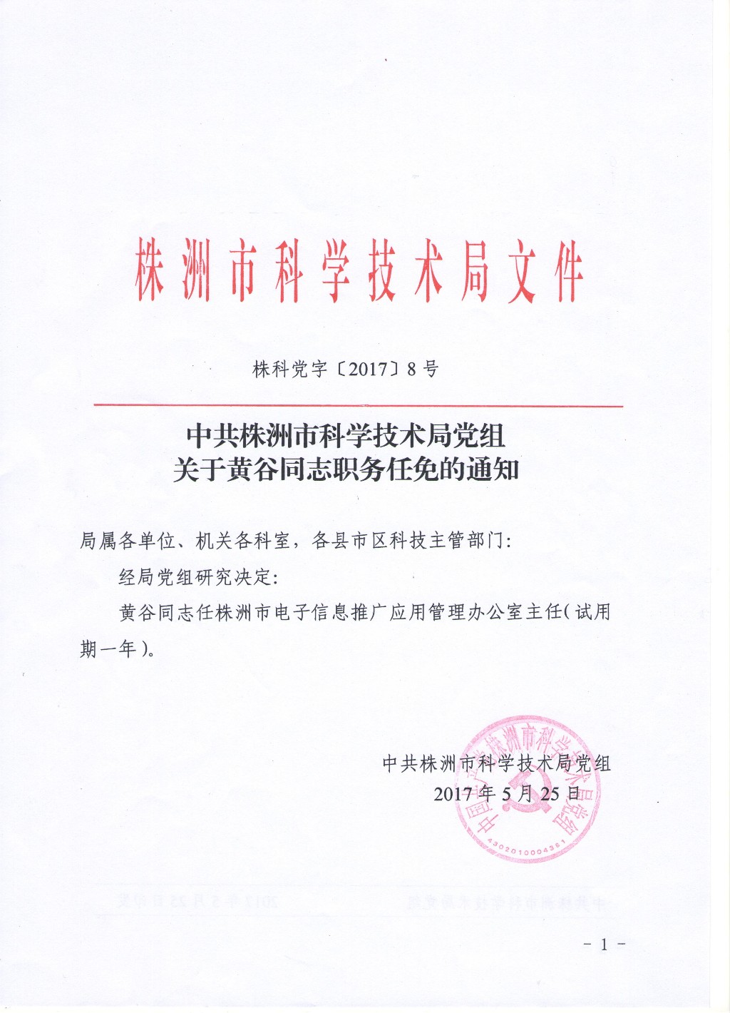 中共株洲市科学技术局党组关于黄谷同志职务任免的通知