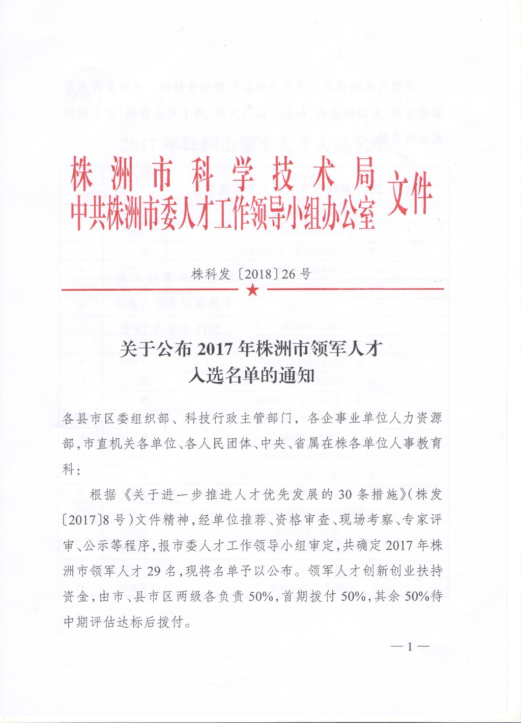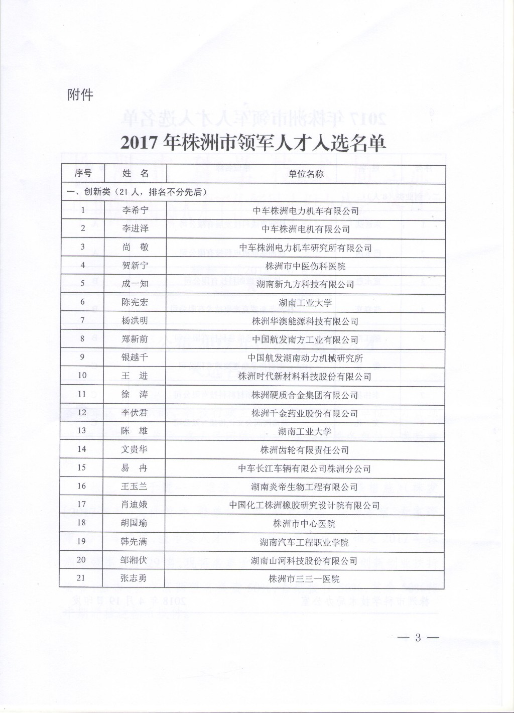 关于公布2017年株洲市领军人才入选名单的通知